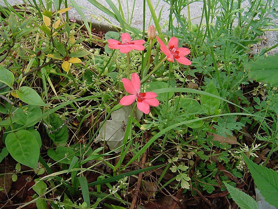 何より一番の問題は此奴のせいで「檜扇」のアイデンティティが揺らいでいることだ。困ったことに「ヒオウギ」を「緋扇」と表記しようとする勢力が台頭しているのだ。確かに「ヒメヒオウギスイセン」で目につくのは赤い花である。それでなくとも人は花の色を最初に見る。そうなると「ヒオウギ」の花は緋色といってもいいが「花のどこが扇に見えるのだ」ということになってしまう。「緋扇」は「赤い扇」という意味しかないのである。花が赤(緋)で葉が扇形とでもぬかすのか。それでは緋色のかけらもない「ヒオウギアヤメ」の立場がないではないか。